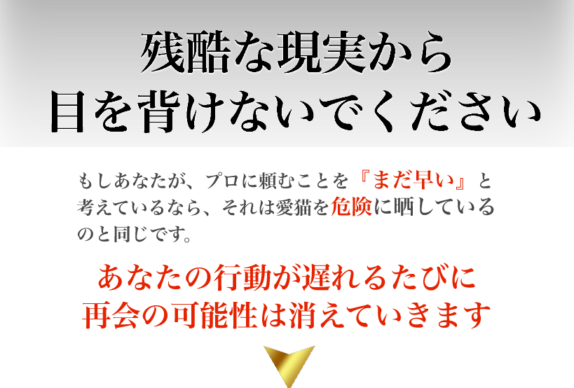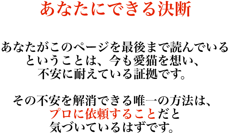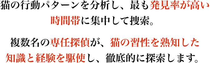 A. サービスの性質上、調査開始後のキャンセル・返金はお受けしておりません。しかし、万が一、捜査員が捜索を怠り、猫ちゃんの保護を逃した場合には費用全額返金させていただきます。